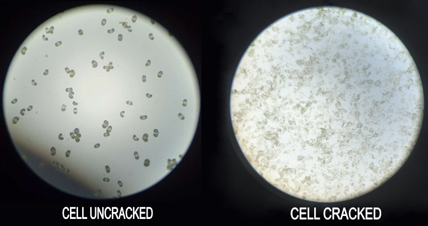 Uncracked pine pollen is much more golden yellow in color, entwisted with sense of lubrication, easy to lift up in the air. When uncracked pine pollen is shaken in a sealed transparent container, it could be found that it has a better flowability. In process of cell cracking, the appearance and some physical properties undergo changes. The color is changing to lighter yellow. Under the microscope, we could find airbag structures have been separated from pine pollen grain main structure and pine pollen grain is not complete like before. This will result in pine pollen looses its fluid/flowability characteristic, instead cell cracked pine pollen is with a strong adhesivity and is hard to lift up in the air.